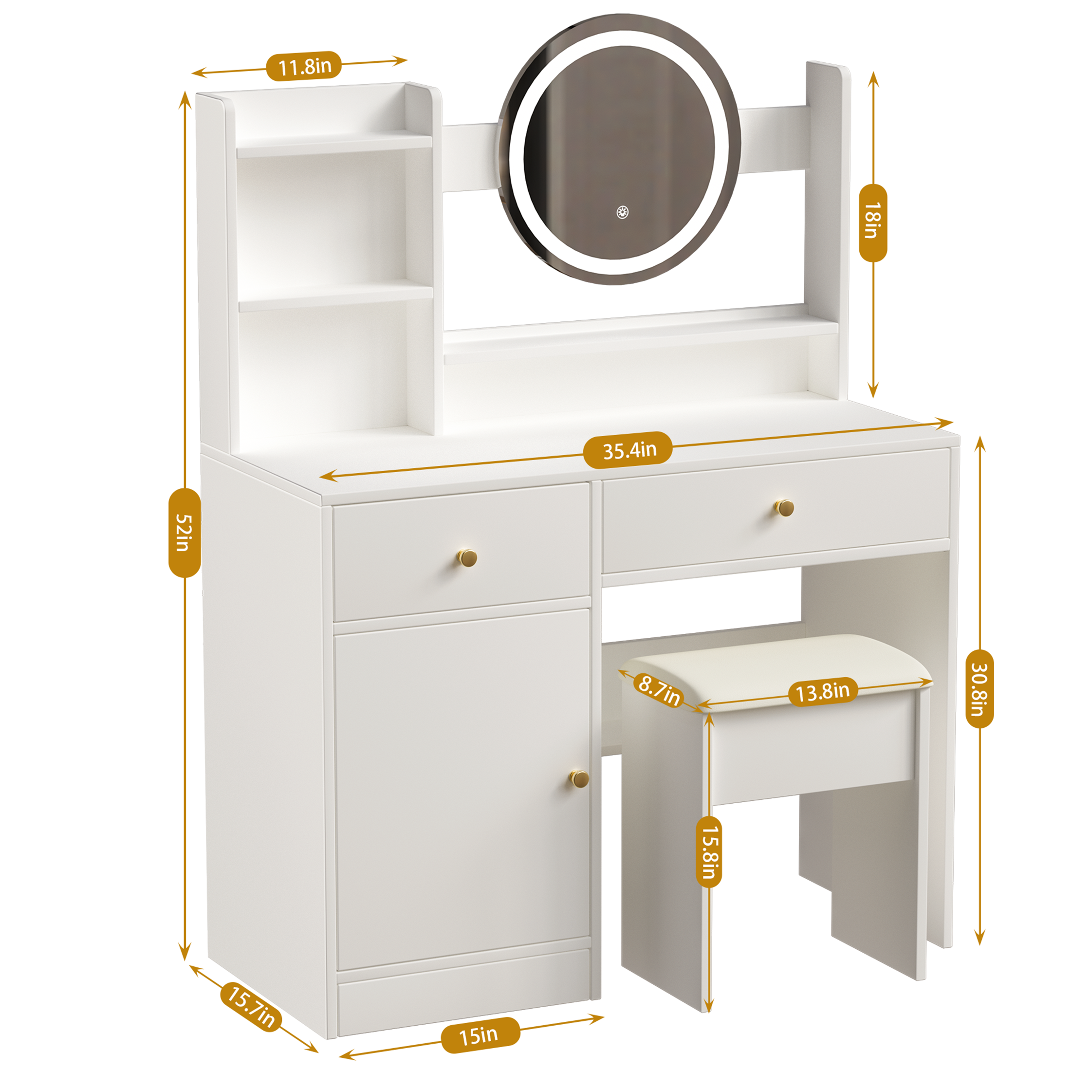 This ENYOPRO vanity table is perfect for anyone who wants to improve their makeup experience. With 3 colors of LED lights, you can choose the perfect brightness for your needs. The large drawer provides ample storage space for all your beauty essentials, so you can say goodbye to clutter and hello to a more organized space! The high-quality MDF board ensures that this vanity table is strong and durable. Specifications: Main Color: White Material: MDF+Glass Product Size: 35.43'' x 15.75'' x 52.36'' Net Weight: 69.44LBS Package Includes: 1 x Vanity Set
