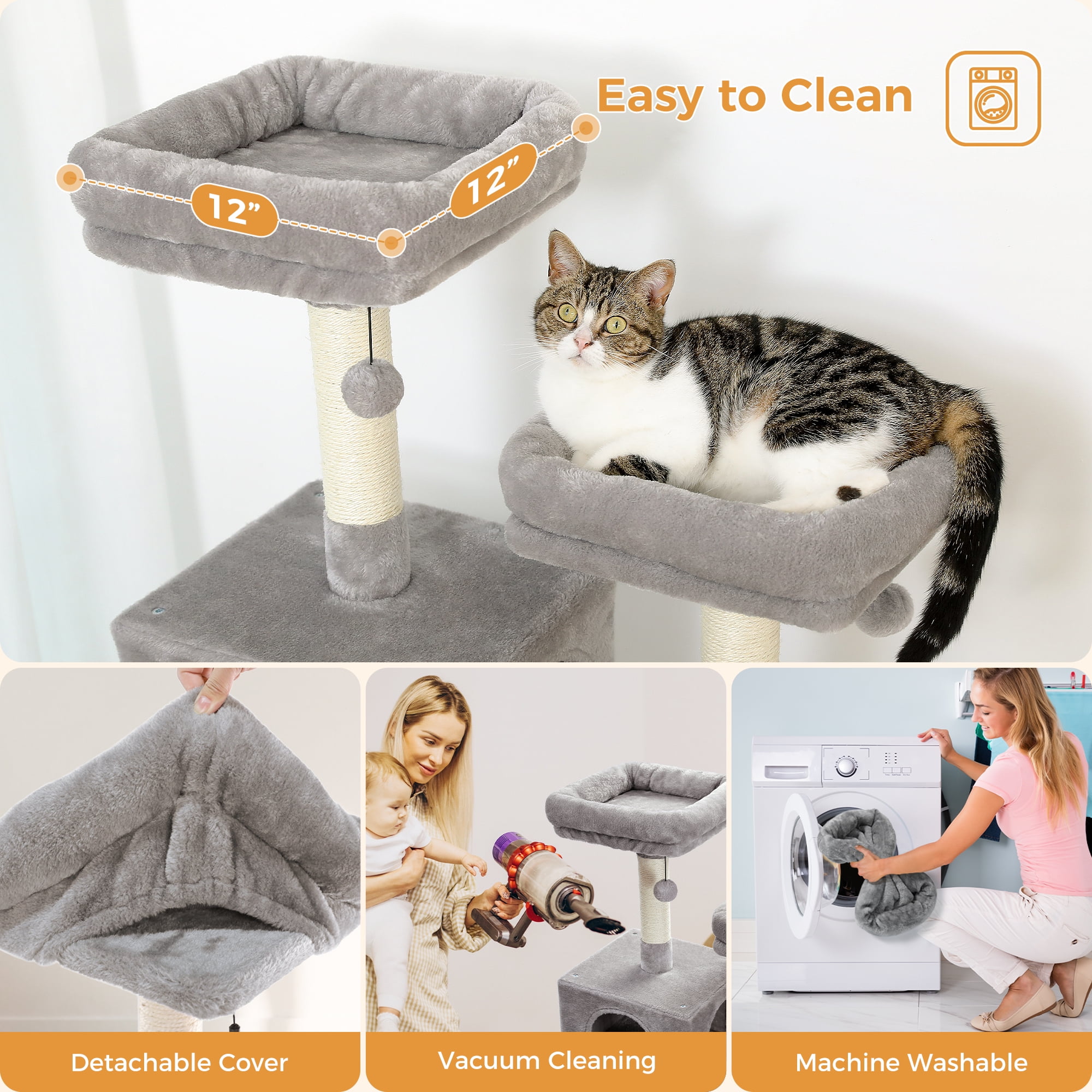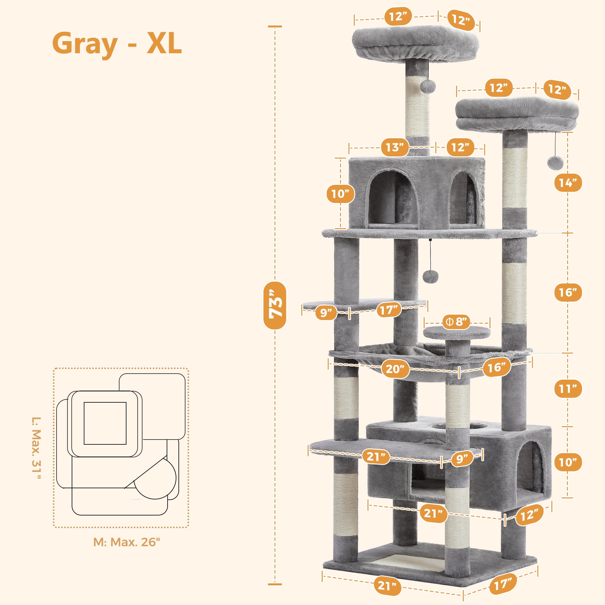 Welcome to PAWZ Road Cat Tree Tower Wonderland! The 6-level XL cat tree is perfect for multi-cat families and active cats. With its all-in-one design, this fluffy large cat condo furniture will definitely be your kitty's favourite spot indoor. The staircase-case layout makes climbing easy. Your furry friend can stretch on the scratching pad, then slip into the large condo cave for a deep sleep, and come into the spacious hammock bed for soaking up sunshine, or leap into the top cat perches for observing the scenery outside the window. What a lovely day your cats live! Stability is the primary consideration for a cat tower. With a reinforced base, sisal-wrapped scratch posts, and anti-tippling devices, this activity center ensures active kitten safety. Spoil your cats with this tall cat tree so they can play and relax when you're away. Please feel free to contact us if you have any concerns about this large cat tree for indoor cats.