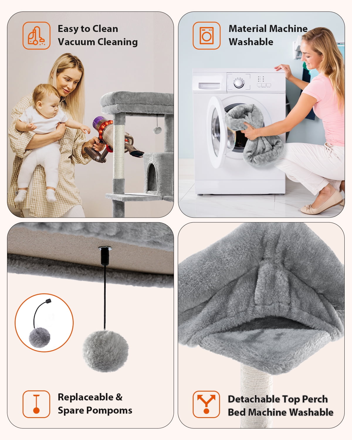 What kind of toys does your furry baby need? Most of the time, cats enjoy lying somewhere to take a nap or stretch themselves. So a durable and safe cat tree tower is really helpful, because it will accompany them most of the time. This cat tree with a large hammock would be the most ideal cat furniture for your cats. A large top perch would be their favorite spot, satisfying their instinct of being in a high position. Cats tend to be very sensitive and alert to their surroundings, so they like to stay in the corners and dark places. The cat tree includes a large condo, a perfect hideaway for them. Did you ever hear about immersive sleep? In the large hammock, your cat will enjoy it. Sinking into the hammock, covered with soft plush, cats will melt into the hammock bed like sugar.