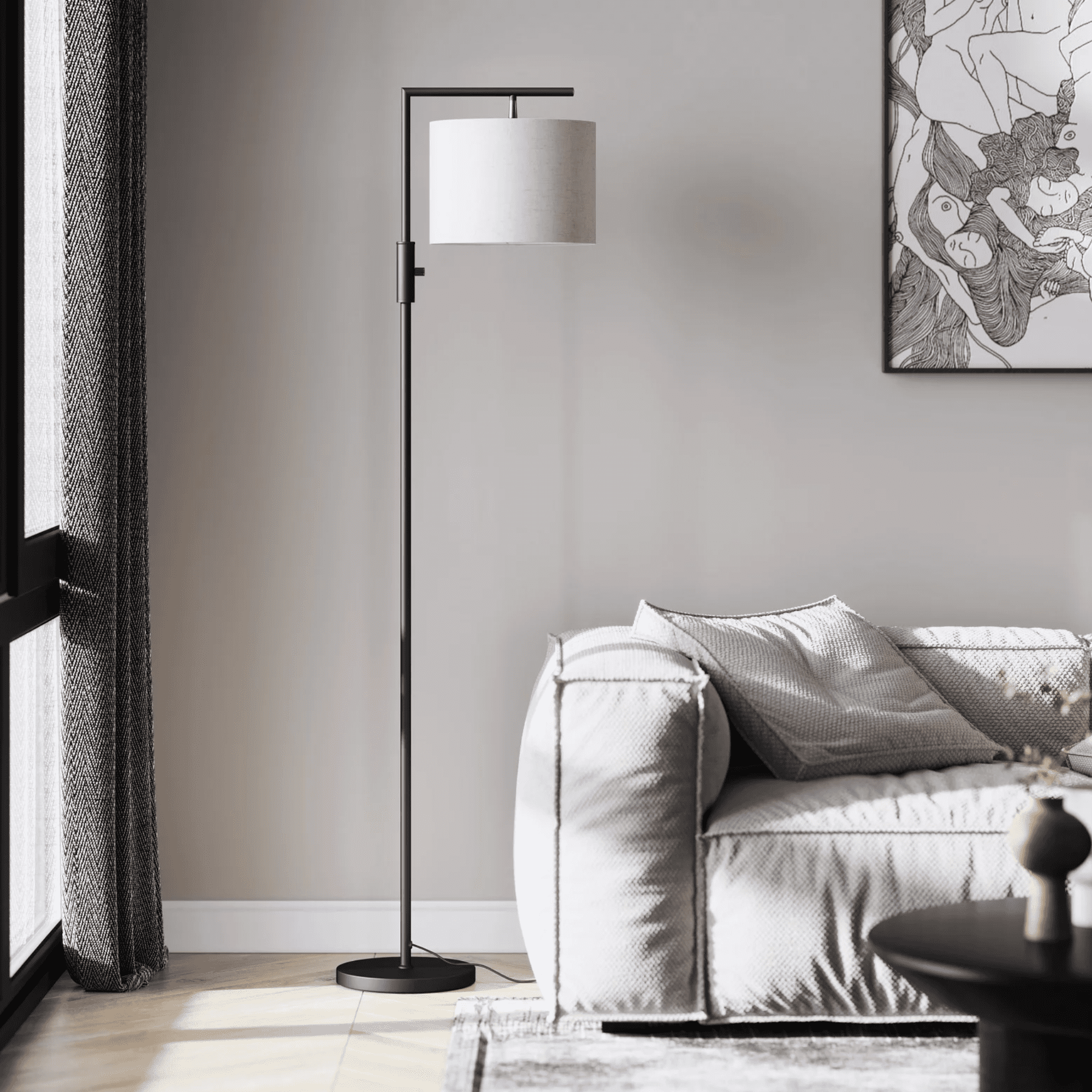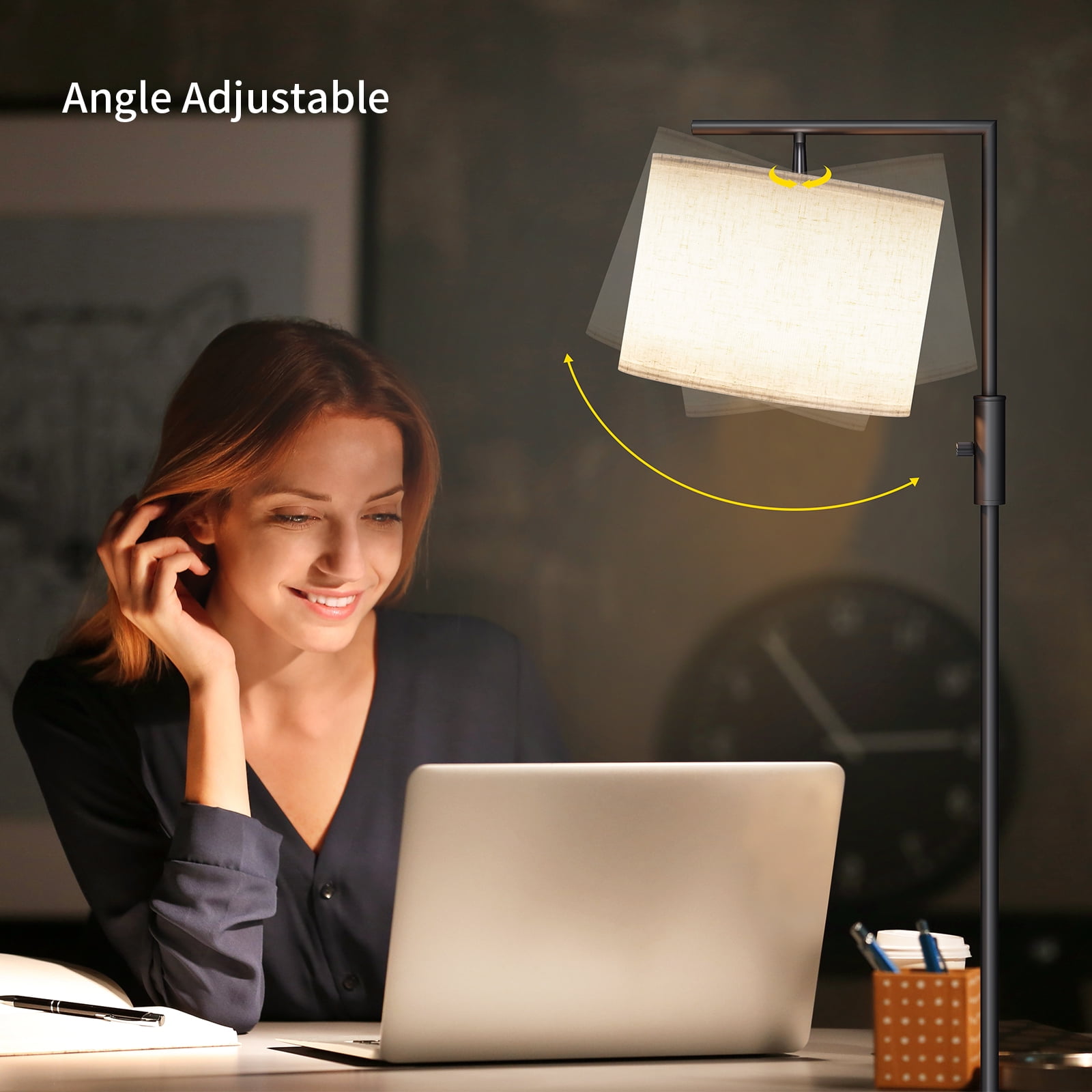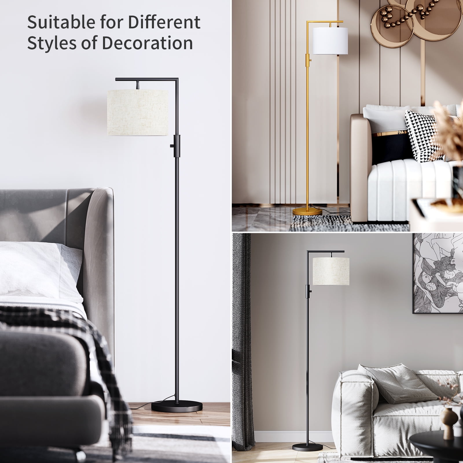 SUNMORY Iron Modern Standing Lamp, Gold Floor Lamp for Living Room, with Rotary Switch, Hanging Shade and 3 Color Temperatures 9W Bulb for Bedroom, Study Room, Office SUNMORY metal floor lamp includes & features a 3 Color Temperature - Dimmable 9-watt 800 lumen LED bulb with a life expectancy of 30,000 service hours. It also features is a convenient, practical, rotary switch. Its upper center location is found in seconds, even in the dark demonstrating ease of use in any lighting environment. The mid-century lamp adopts a rotating lamp head, can be rotated horizontally or vertically at a certain angle, directing the light where needed. The lampshade of the arc lamp living room floor lamp can be disassembled for easy cleaning. Specifications: Material: Linen Color: Black/Gold Brand: SUNMORY Style: Modern Buld Base: E26 Shade Color: Off-White Item Weight: 9.6 pounds Product Size: 18.3 x 11.8 x 64 inches Assembly Request: Yes Finish Types: Painted Shade Material: Fabric Light Direction: Adjustable Wattage: 9 watts Maximum Compatible Wattage: 60 Watts Voltage: 120 Volts Type of Bulb: LED Switch Style: Rotary Batteries Required: No Average Life: 30000 Hours Luminous Flux: 800 Lumen Power Source: Corded Electric Color Temperature: 6000 Kelvin Package Included: 1 x LED Floor Lamp 1 x Lampshades (Linen) 1 x LED Bulb 1 x User Manual1