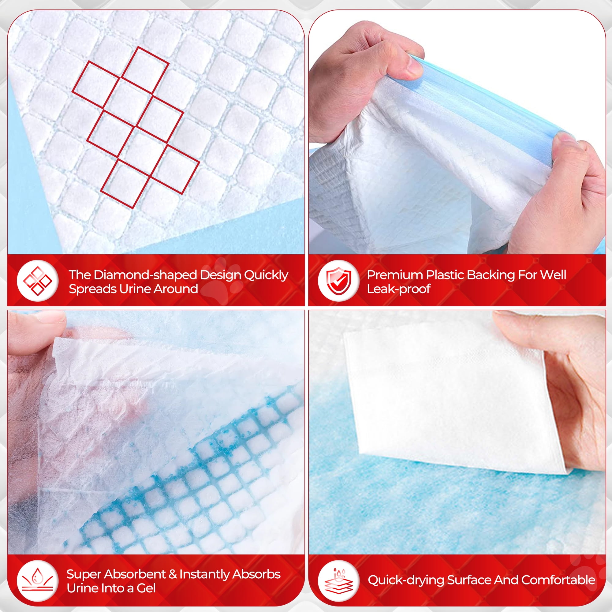 Pet's perfect life starts with using them - Pet Training Pads for Dogs and Puppies. Try out these super absorbent training pads today! Mess-Free Disposable Dog Pee Wee Pads use for pet size small and medium, with features in Super Absorbent / Quick-Drying No-Track Surface/Splash-Prevention Quilted Pattern/6 Layer Protection. Tolobeve Puppy Pads give your dogs the best chance for successful potty training. Our pet training pads offer superior performance and reliable convenience so that your puppy learns fast and always knows where to relieve himself correctly.In addition to training young puppies, our pads also work well in daily use of small and medium sized dogs, and elderly dogs with no mobility. Choose our puppy pads different size and packs, 40, 50, 100, or 160 packs to suit your dogs. This link Large size pads Quantity is 100 count.