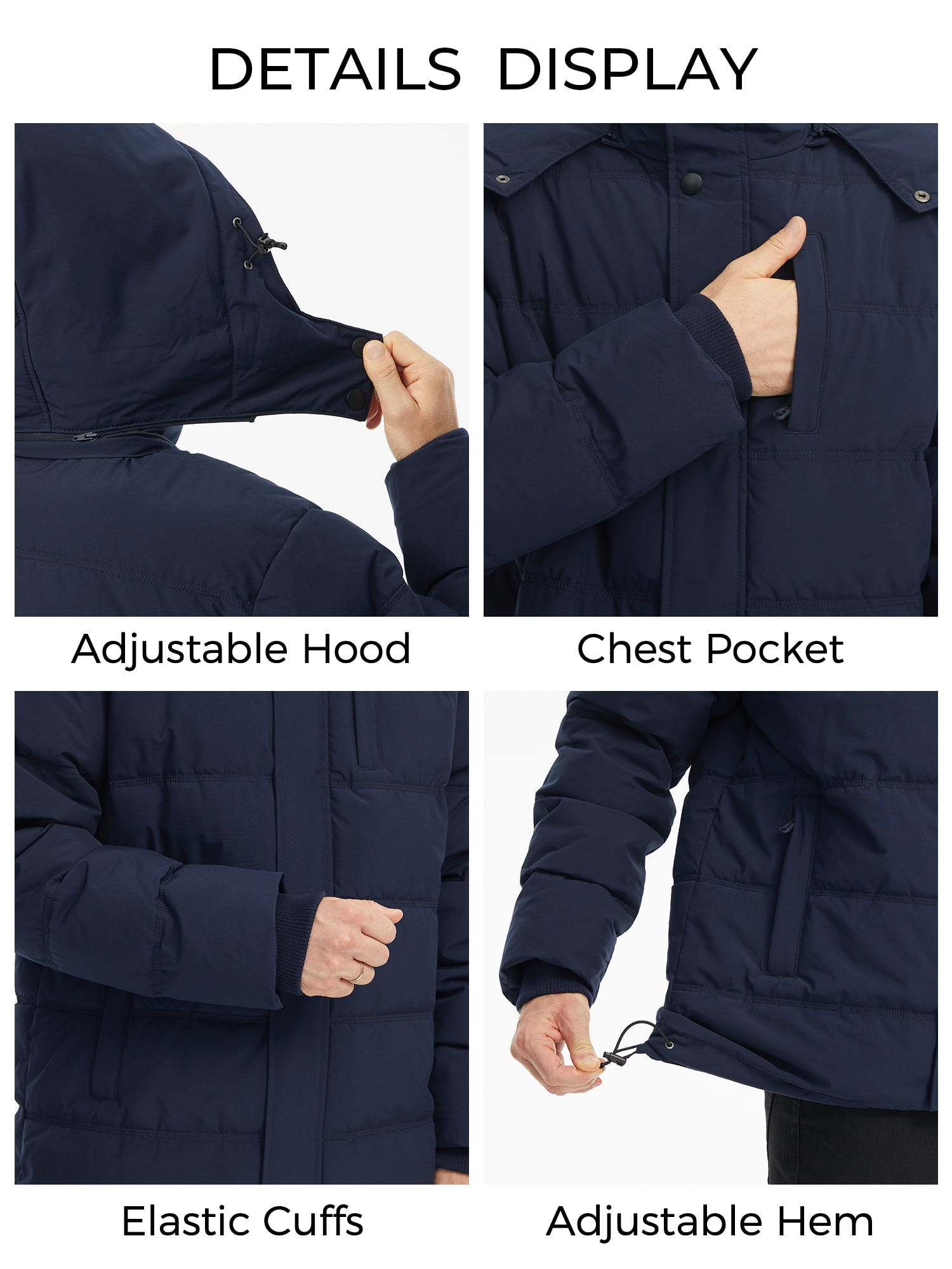 Gender: Male Colors: Black, Dark Gray, Navy, White Sizes: S/M/L/XL/2XL Shell: Recycled Fabric Hood Type: Removable Hood Pockets: 1 chest pocket, 2 hand pockets, 1 inner pocket Wantdo men's warm winter coat is ideal for tackling winter's harshest conditions. Crafted from recycled materials, this recycled winter jacket for men offers a 10,000mm waterproof rating and exceptional insulation, ensuring all-day dry comfort and warmth. Enhanced with a detachable hood, reinforced zippers, and wind-resistant cuffs, this men's puffer jacket with hood provides added warmth and utility. Perfect for outdoor activities like skiing, snowboarding, or simply braving the urban commute in style and comfort.