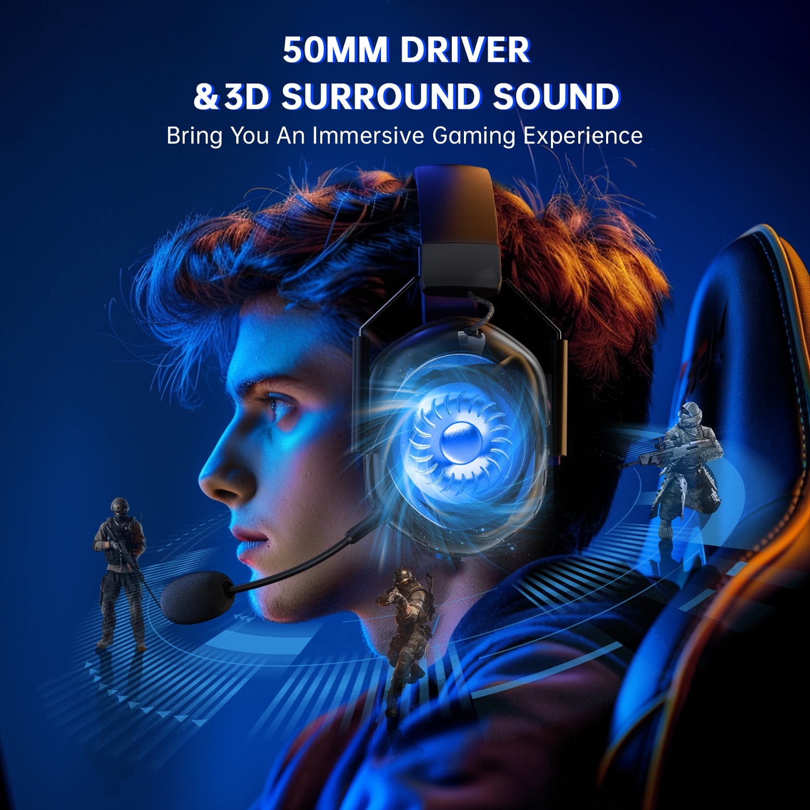Wireless gaming headset has lower latency (<=20ms), providing instant audio feedback without any noticeable delay. And equipped with 50mm speakers and cutting-edge 3D surround sound technology, it ensures that the wireless gaming headset provides higher quality stereo sound, allowing you to clearly perceive every sound detail in the game and get a better immersive gaming experience.
